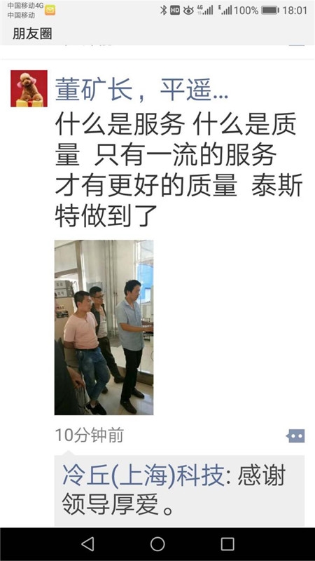 2018年6月28日,工程部技術(shù)工程師翟碩飛在平遙興盛鴻發(fā)礦進(jìn)行售后服務(wù)過程中,體現(xiàn)出的業(yè)與態(tài)度獲得了客戶的好評(píng),平遙煤化董礦長將其轉(zhuǎn)發(fā)朋友圈,為泰斯點(diǎn)贊,高度贊揚(yáng)了泰斯業(yè)、負(fù)責(zé)、高的工作作風(fēng),這是次客戶在公開場合對(duì)公司進(jìn)行點(diǎn)贊,并進(jìn)行傳播。這是泰斯公司的光榮,也是整個(gè)售后團(tuán)隊(duì)的光榮。